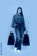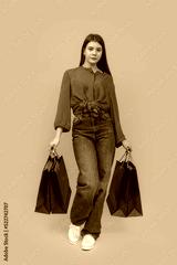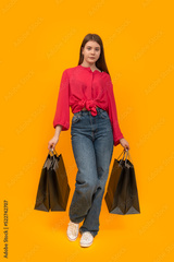 Portrait of young girl with paper bags in her hands on bright yellow background. Shopping concept. Vertical frame.
