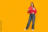 Full-length portrait of young girl with the flag of Italy on orange background. Learn Italian. Immigration to Italy. Copy space.