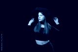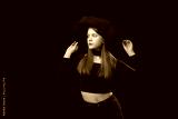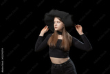 Young woman wears tight-fitting black top and wide-brimmed hat. Studio portrait on black background. Copy space.