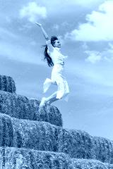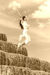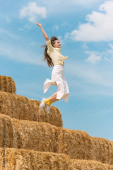 Girl while jumping on big haystack. Woman has fun and jumps in the hay on blue background.