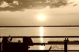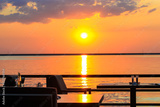 Silhouettes of tables chairs on cafe restaurant terrace against background of red yellow-orange sky at sunset. The sun is setting over a horizon. Beautiful tranquil seascape. Vacation trip concept.