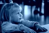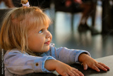 A pretty little blonde girl sits at a table in a cafe restaurant with her hands on the table waiting for food. Tomorrow, dinner at the bistro. A dreamy 3-5 years old child looks up. Selective focus.