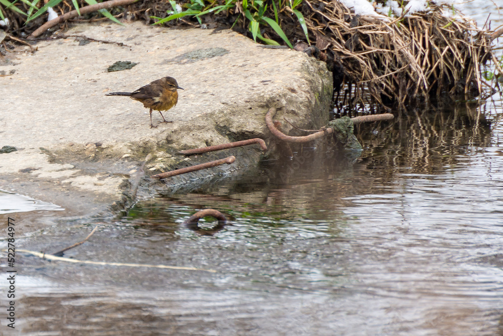 Zmarznięty i przemoczony ptak siedzący na betonie nad rzeką.