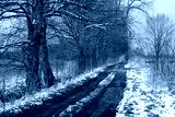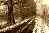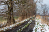Wczesna wiosna, wiejska droga, śnieg, trawa, błoto i drzewa.