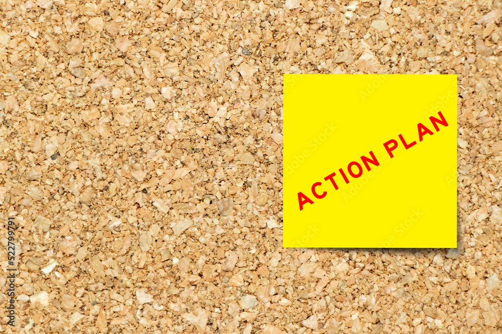 Yellow note paper with word action plan on cork board background with copy space