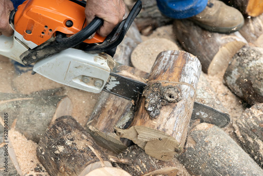 Chainsaw Work in Home Backyard Close up