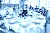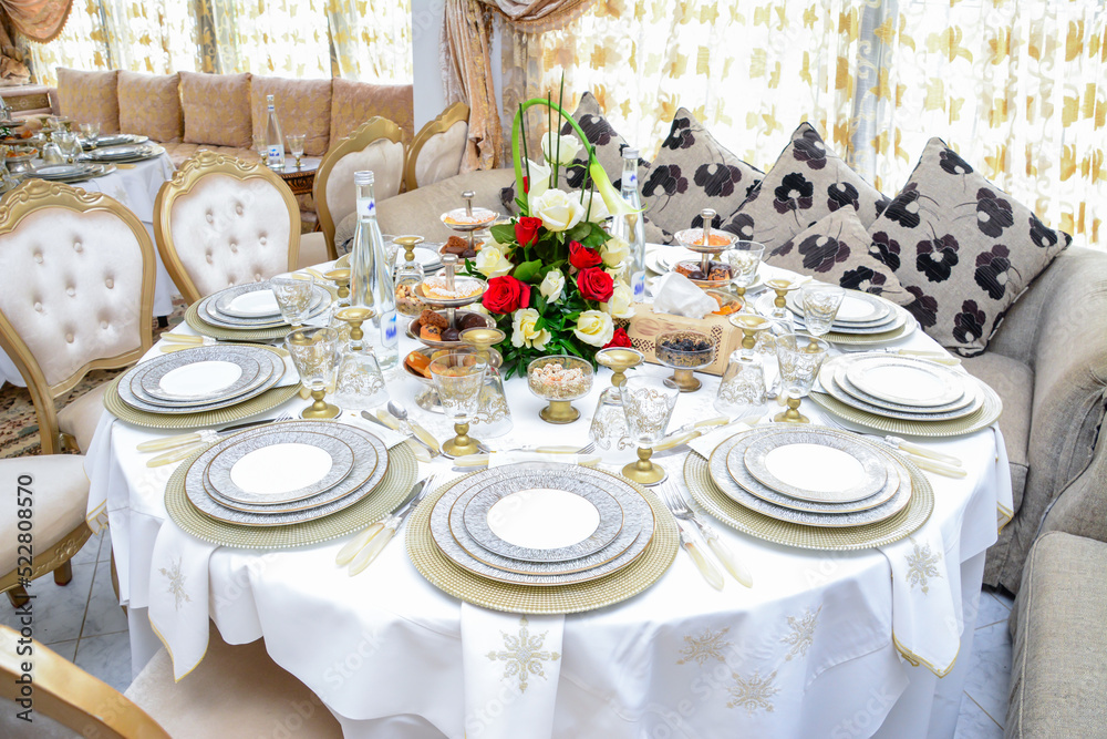 Moroccan salon with wedding table plates, cups and chairs