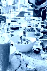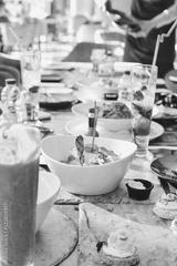 Waiter preparing buffet table with canapes and salads with vegetables..