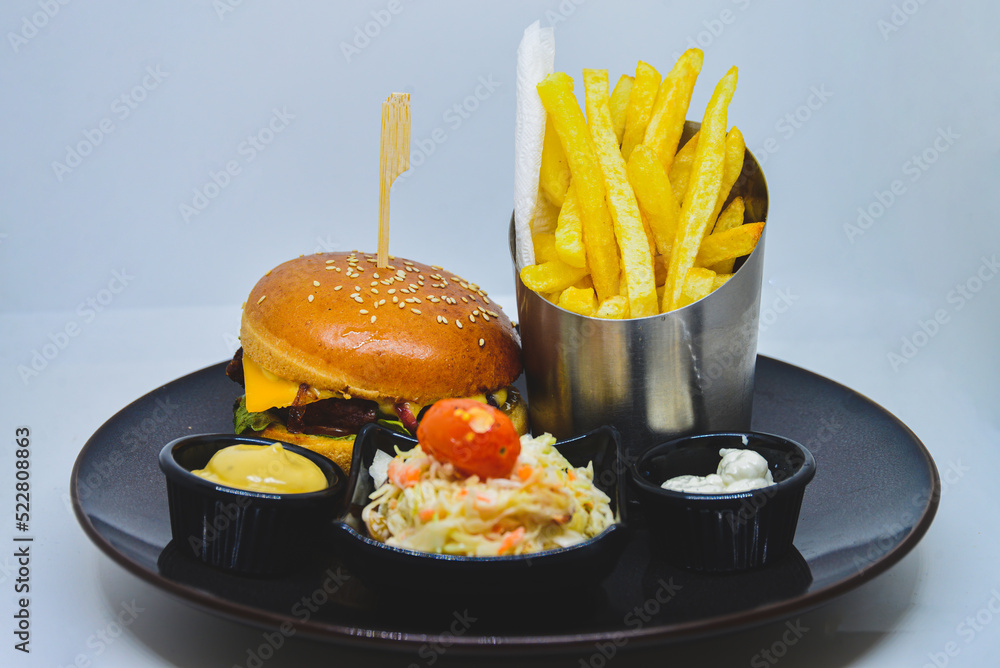 fast food menu. hamburger, french fries and salad. burger with beef stake, cheese and pickle. mayonnaise ketchup mustard on the plate.