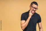 Photo of young African American black man isolated over beige background suffering from terrible pain in teeth, showing it on his face vividly, looking troubled and distressed.