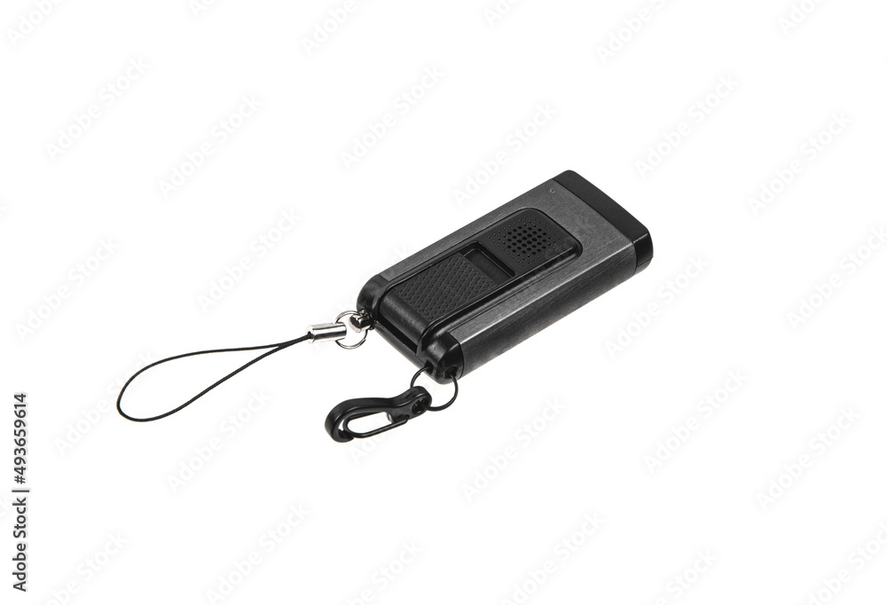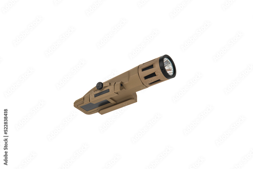 Modern LED flashlight with weapon mount. Underbarrel tactical flashlight isolate on white back.