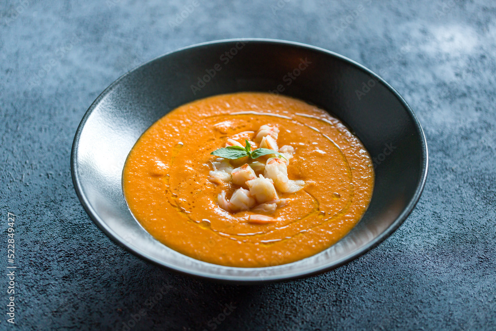 Pumpkin cream soup with shrimp on black bowl selective focus
