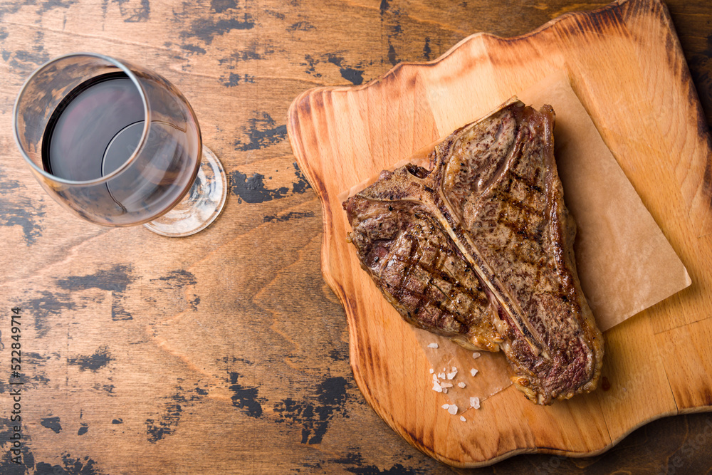 Steak T Bone, tibon steak, steak on bone on wooden table with red wine top view, copy space for text