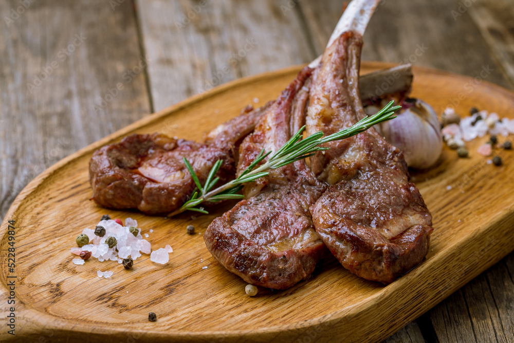 Rack of lamb with salt pepper and rosemary on old wooden table macro close up
