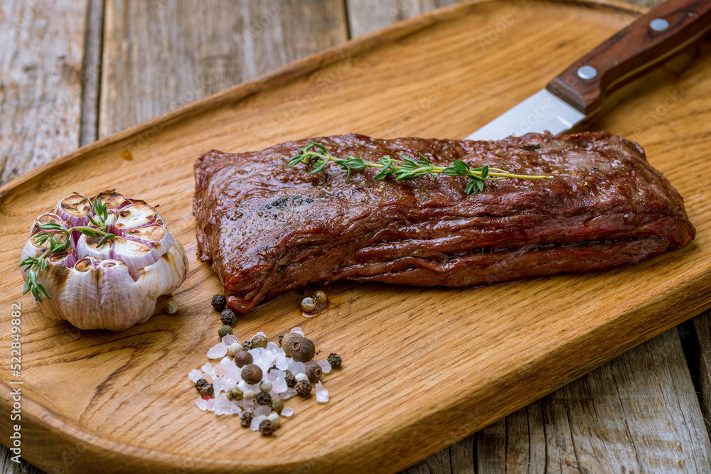roast beef Steak with salt and pepper on the board on old wooden table macro close up