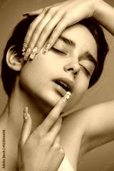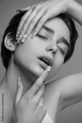 Affectionate pretty girl with short haircut and extravagant nail art