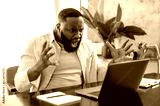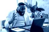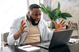 Irritated angry african american man, company worker, freelancer, ceo company, sitting at a desk in modern office, yelling at the laptop, dissatisfied with the result, annoyed emotional state