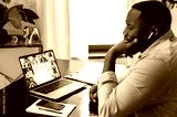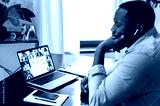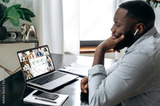 Online business meeting, briefing. African american successful entrepreneur, ceo, sitting at a desk, having a financial brainstorm with colleagues on a video conference, analyzing a financial strategy