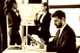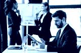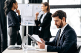 Busy focused business man in a formal suit, sit at workplace in the office, looks out the documents, financial reports. On the background his female colleagues discussing financial strategy