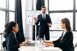 Elegant Caucasian intelligent male boss, holding group brainstorm with female colleagues, discussing ideas for a new business project, makes a business plan presentation to his female partners