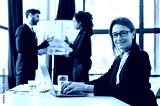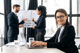 Confident elegant caucasian business woman with glasses, sitting at the desk at conference, near laptop. Beautiful elegant female employee on briefing meeting, looking at the camera, smiling friendly