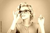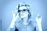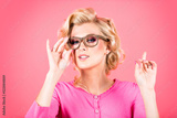 Portrait of young blonde woman wearing glasses against pink background.