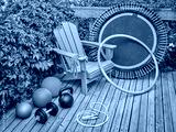 home gym and recreation concept - slam balls, iron kettlebell, dumbbell, mini trampoline, resistance band, jump rope, and hula hoop with Adirondack chair on a backyard patio