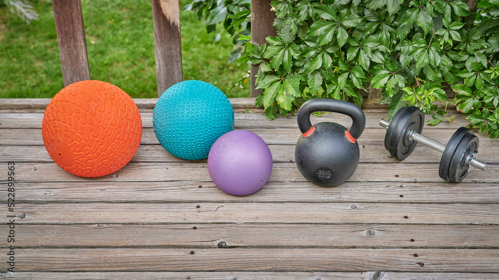 three heavy slam balls, iron kettlebell and dumbbell on a backyard deck, home and backyard gym concept