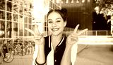 people, gesture and education concept - happy smiling teenage girl showing peace signs over city street or school yard background