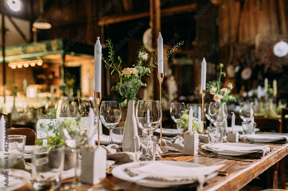 Festlich gedeckter Tisch auf einer Hochzeit in einer Scheune Landhochzeit