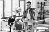 blogging, furniture restoration and home improvement concept - happy smiling man or blogger with camera showing old wooden chair renovation and recording tutorial video