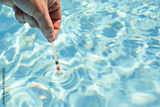 Checking the water quality of a pool with the help of a test strip with PH value, chlorine and algaecide