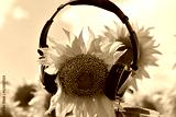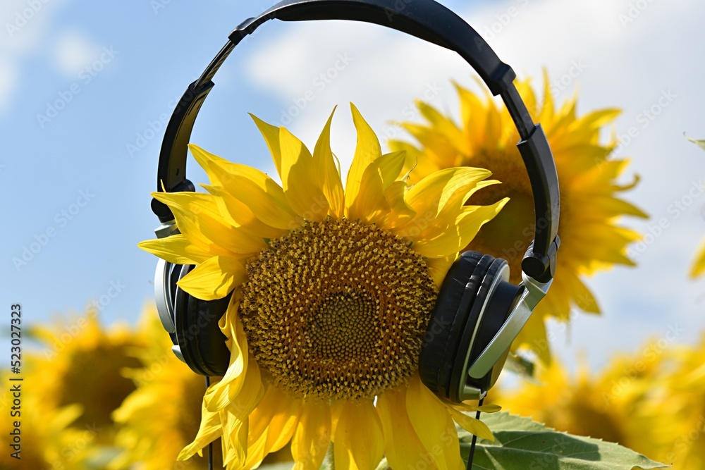 sunflower flower in headphones. the concept of caring for nature, being able to listen to nature, the relationship between man and nature