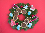 Christmas ring or wreath with gingerbread and dried orange on the red background. Top view. Close-up.