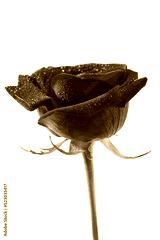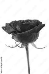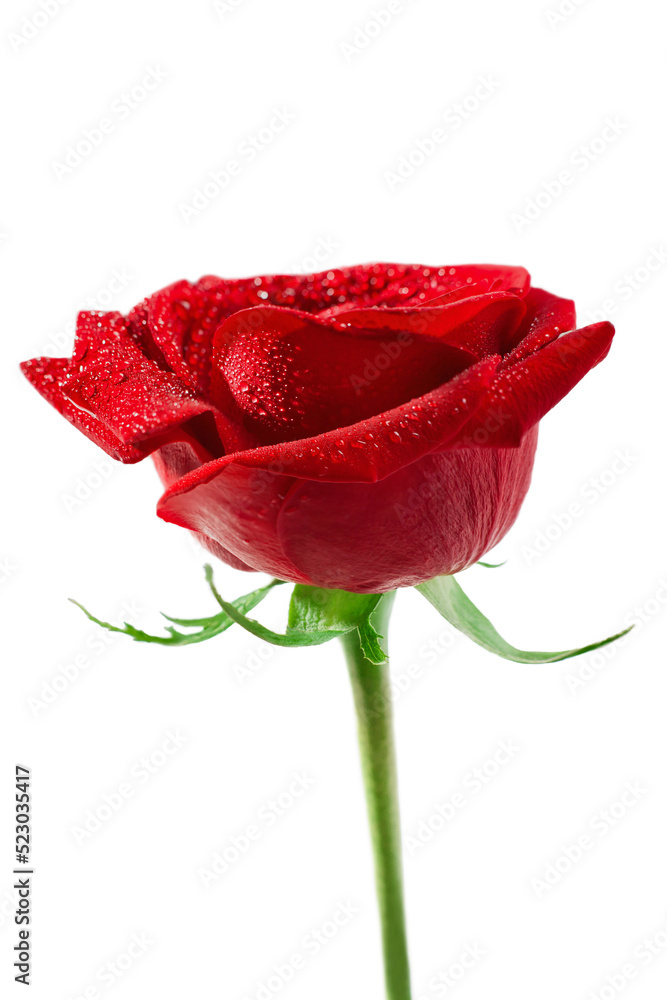 Fresh red rose isolated on white background. Raindrops on petals. Close-up. Side view. Copy space
