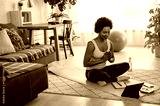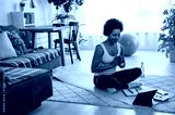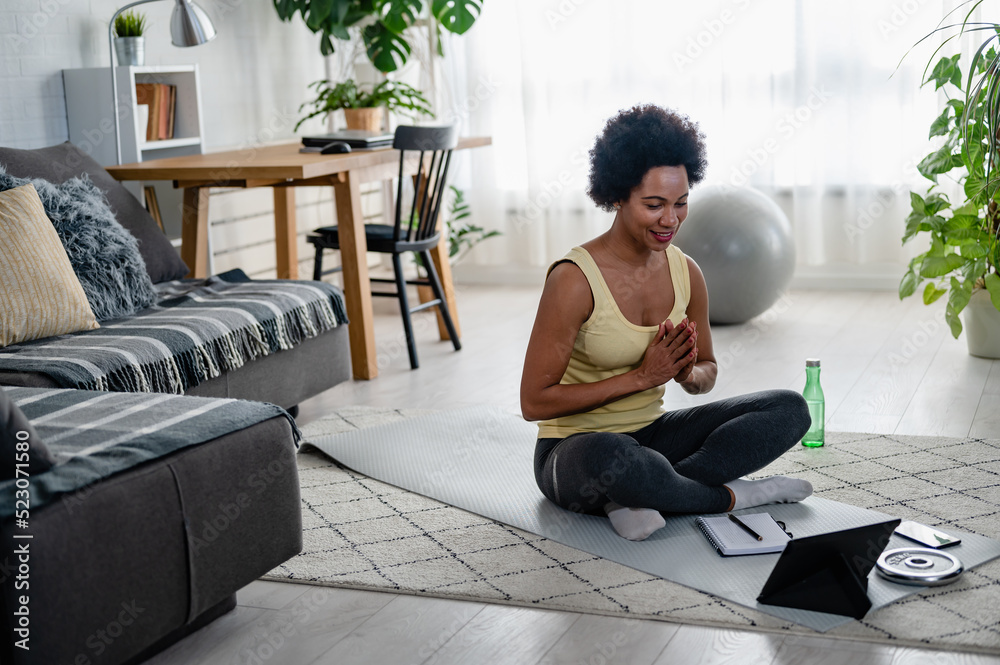 African-American woman having online yoga fitness class. Sitting at home on a floor and communicating over her notepad computer.