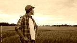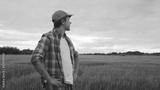 Farmer in front of a sunset agricultural landscape. Man in a countryside field. Country life, food production, farming and country lifestyle.