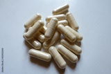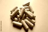 Closeup of heap of light beige capsules of Saccharomyces boulardii probiotic