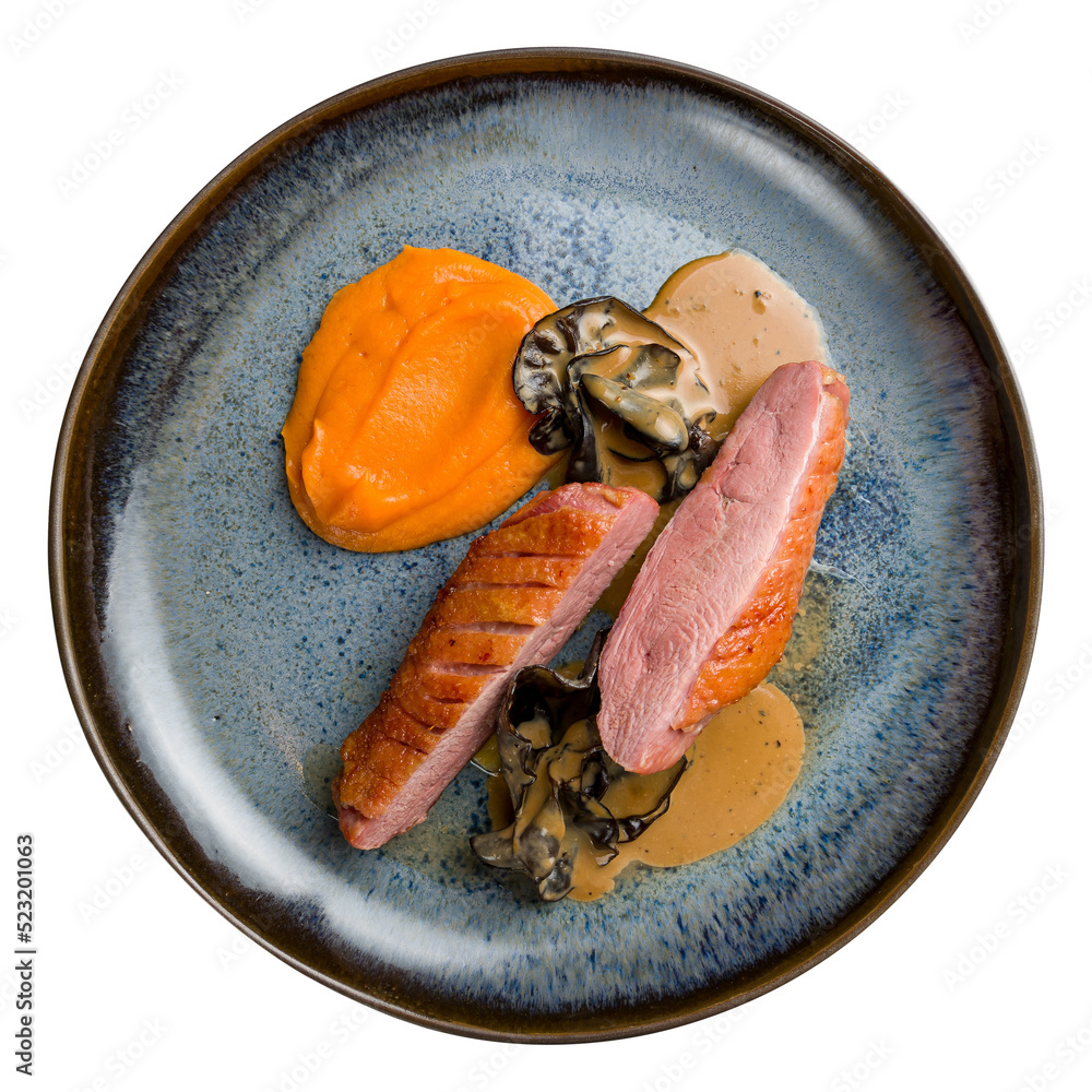 Duck breast with black mushrooms and mashed pumpkin on plate isolated on white background top view