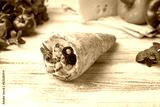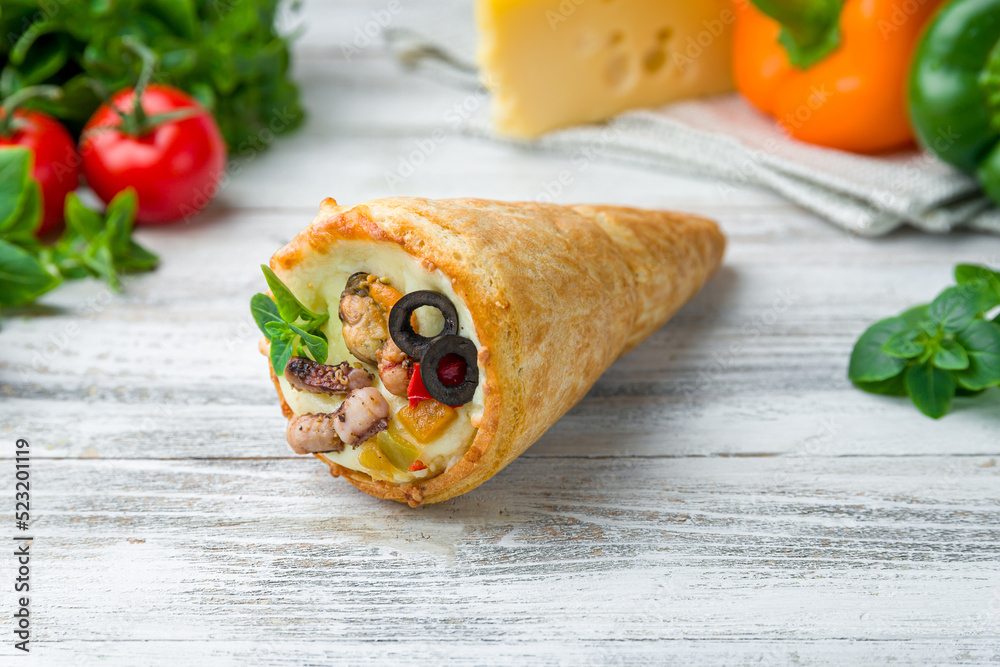 pizza in a cone with cheese and seafood on white wooden table