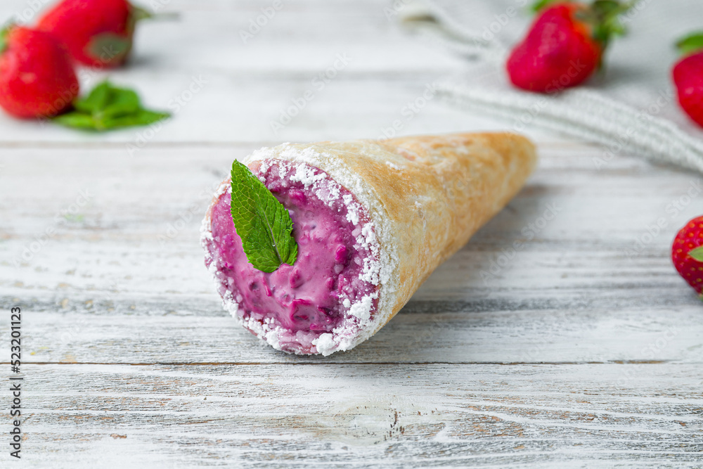 Sweet pizza in a cone with strawberry and mint on white wooden table
