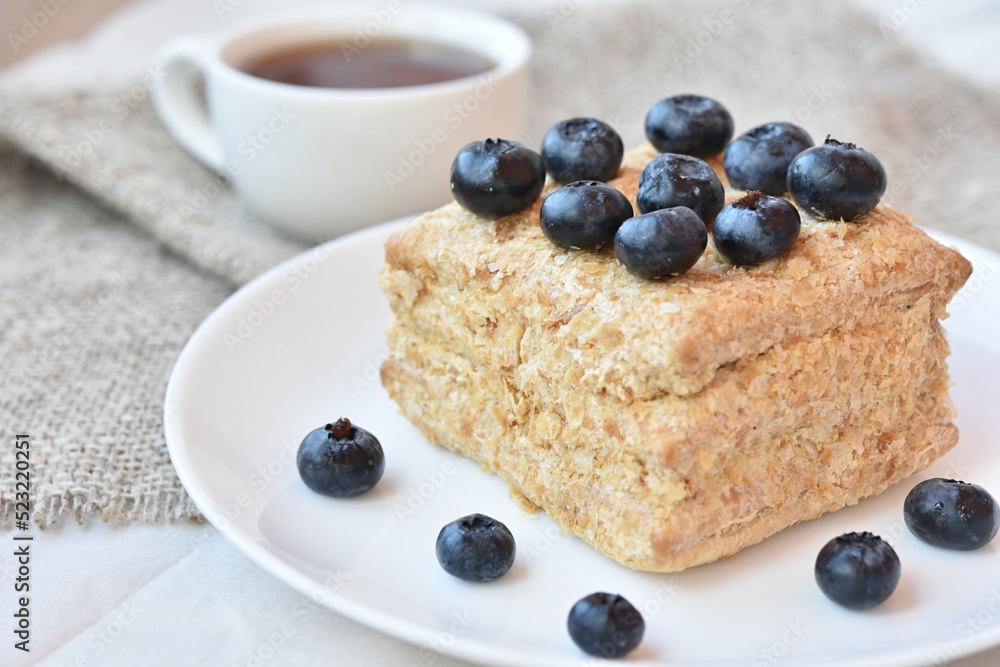 cake napoleon with blue blueberries. sweet life concept, dessert
