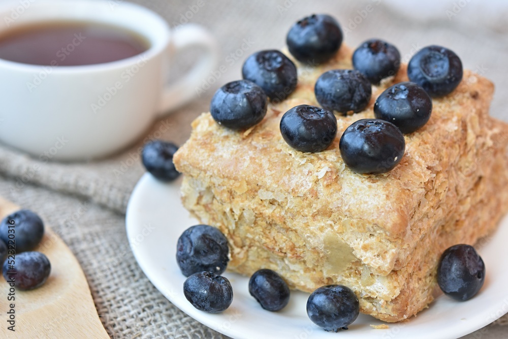cake napoleon with blue blueberries. sweet life concept, dessert