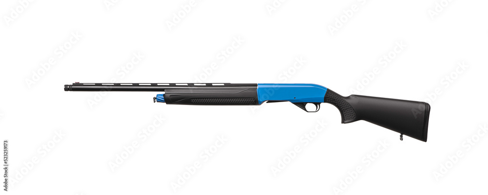Modern semi-automatic shotgun. Weapons for sports and hunting. Black blue weapon isolate on white back.