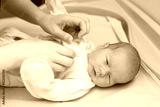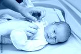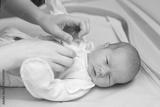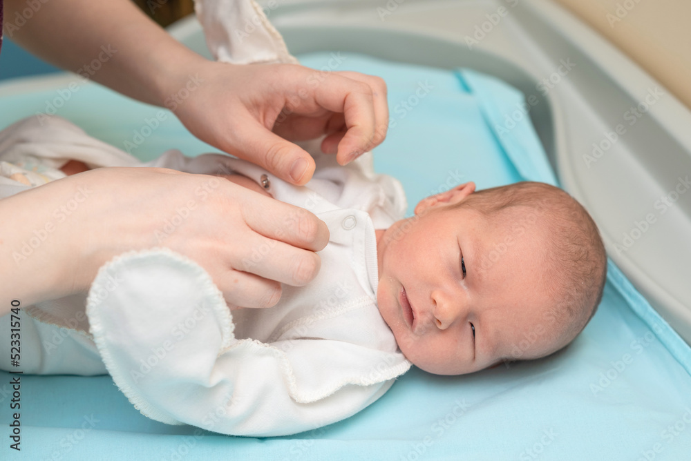 Sleeping newborn baby wrapped in baby sleepsuit in acrylic hospital right after birth.