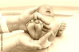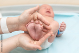 Mother hands holding newborn baby feet. Healthcare concept. Newborn baby in the hospital