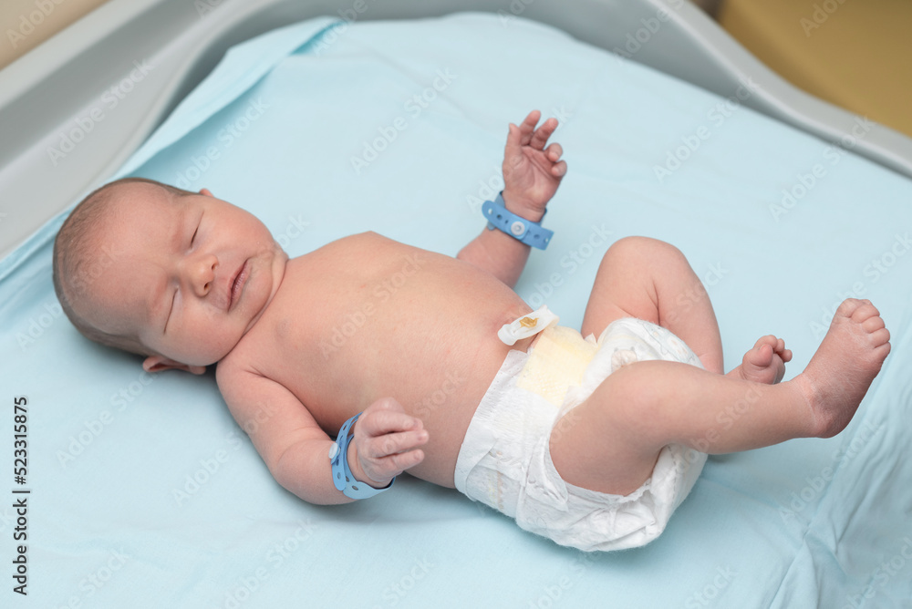 Newborn baby hand with name tags bracelets. Infant boy first day of life in bassinet bed at hospital. First days of life. Healthcare concept. Newborn baby in the hospital.