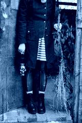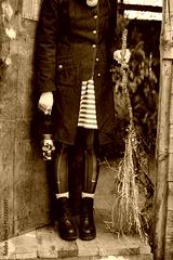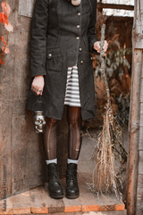 Woman with skull candle holder and broom while standing on doorstep of wooden house during Halloween