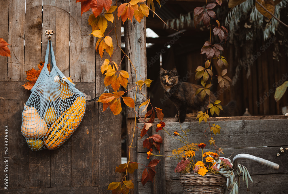 String shopping bag with autumn harvest hanging on old rustic wooden door