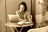 Photo of beautiful Asian student watches training webinar on laptop computer writes down important information in notebook poses at table in cozy room. Female copywriter watchs website video